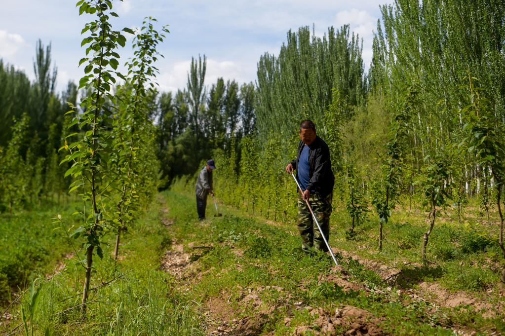 6月5日,臨河區國營(yíng)新華林場(chǎng)工人在管護林木。新華社記者 李志鵬 攝