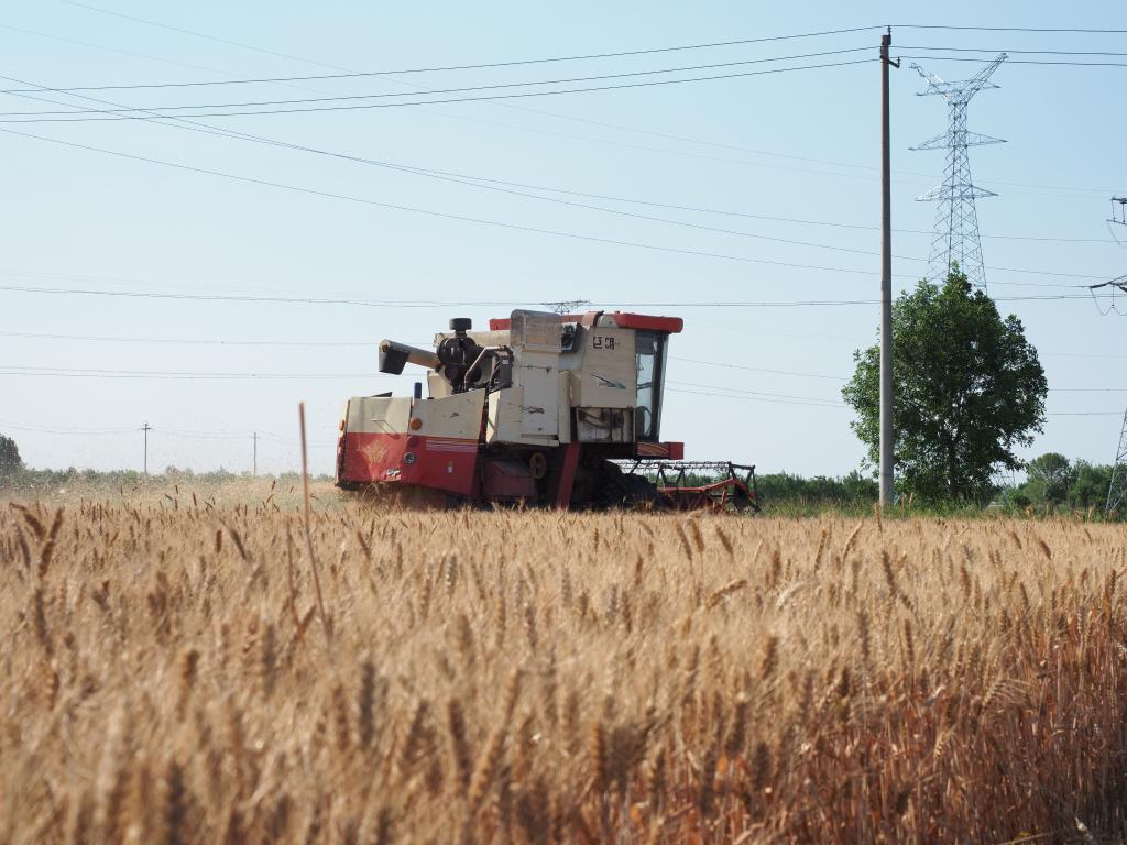 在山東省濱州市無(wú)棣縣水灣鎮王化如村,收割機正在麥地進(jìn)行作業(yè)。新華社記者 高天 攝