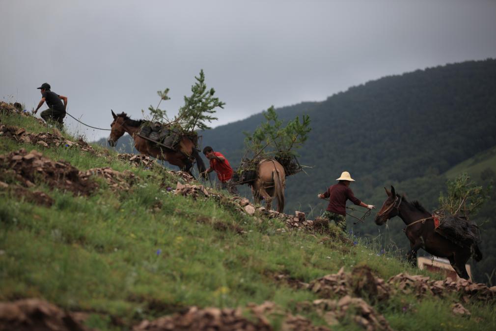 在承德豐寧滿(mǎn)族自治縣千松壩林場(chǎng),群眾將樹(shù)苗運往山上。王立群 攝
