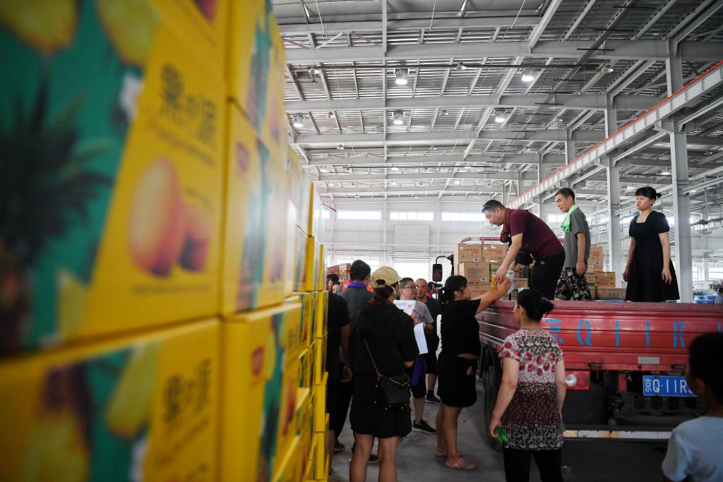 8月5日,工作人員和志愿者在涿州市鋼研物資儲備點(diǎn)內將捐贈物資裝車(chē)外運。新華社記者 牟宇 攝