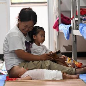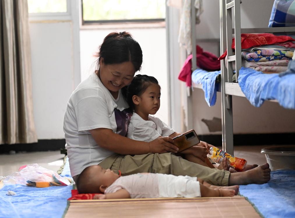 8月12日,在天津市靜海區大邱莊中學(xué)集中安置點(diǎn),轉移群眾在宿舍內照看孩子。新華社記者 趙子碩 攝