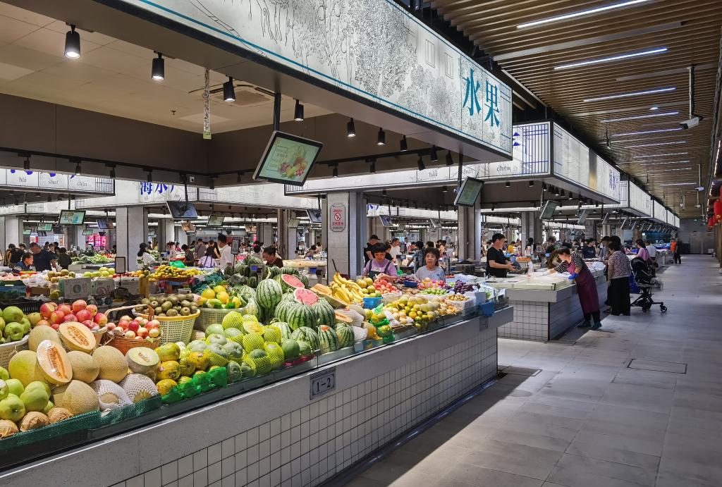 過(guò)道寬敞明亮,攤位井然有序,地面不見(jiàn)污漬,墻角沒(méi)有垃圾。抬頭一看,智慧顯示屏上攤主信息、今日菜價(jià)寫(xiě)得清清楚楚;手機一查,小程序里農貿產(chǎn)品質(zhì)量抽檢結果標得明明白白。