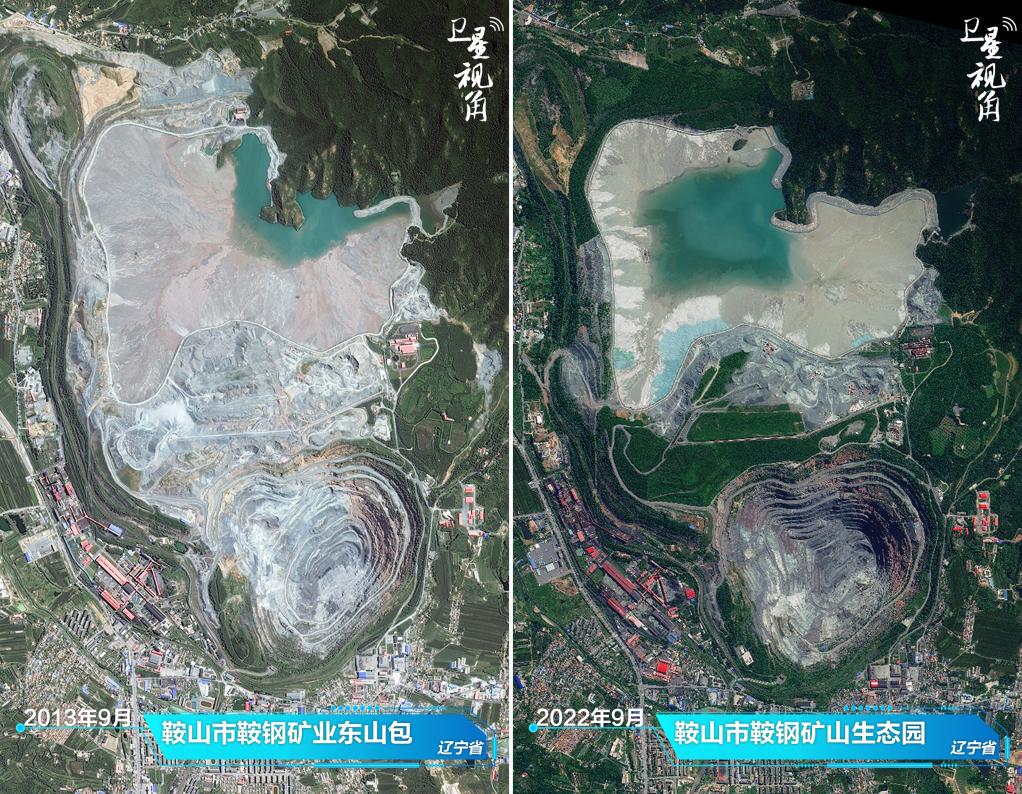 ↑2022年與2013年相比,曾經(jīng)塵土飛揚的鞍鋼礦山,如今蛻變?yōu)闈M(mǎn)眼綠意的生態(tài)園。