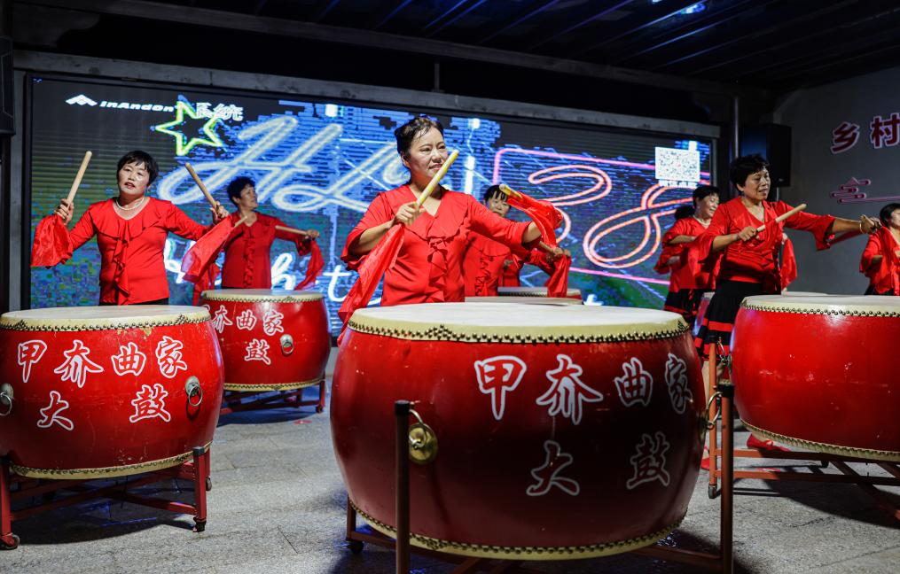 在山東省榮成市夏莊鎮甲夼曲家村鄉村大灶臺,村里的志愿者為食客們表演漁家大鼓。新華社發(fā) 李信君攝