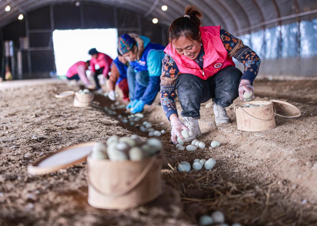 山東省榮成市夏莊鎮甲夼曲家村,李曉娜(前一)和村民們在收獲麻鴨蛋。新華社發(fā) 李信君攝