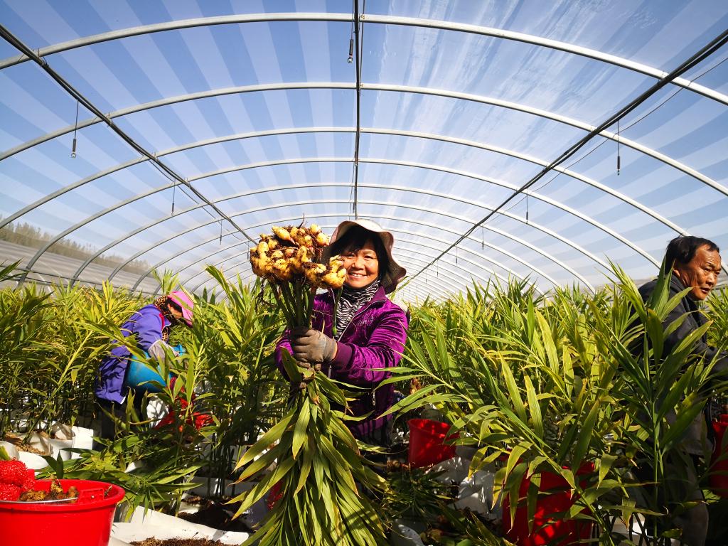 在山東姜公農業(yè)科技有限公司種植基地,大棚內種植的有機生姜迎來(lái)豐收。(新華社記者王志 攝)