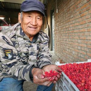 甘南縣東陽(yáng)鎮聯(lián)合村村民劉樹(shù)合手捧剛采摘下來(lái)的紅樹(shù)莓。新華社記者張玥攝