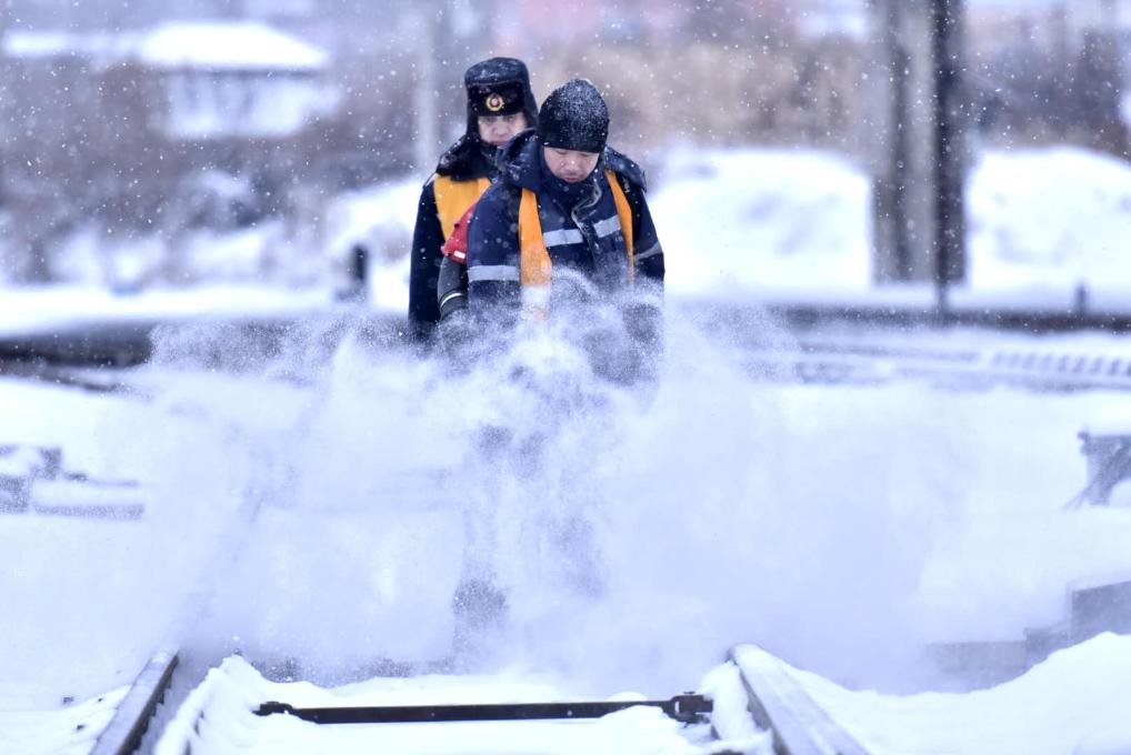 工人們在為鐵軌清雪。(中國鐵路哈爾濱局集團有限公司供圖)