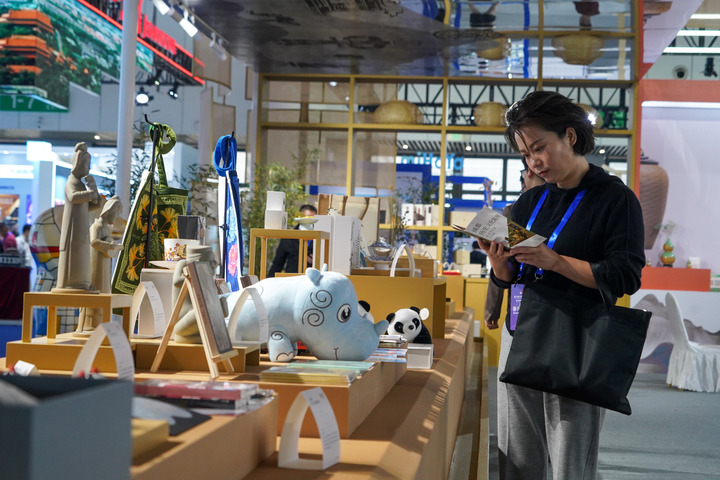 在版博會(huì )展覽現場(chǎng),參會(huì )嘉賓在了解文創(chuàng )產(chǎn)品(新華社記者 唐文豪 攝)