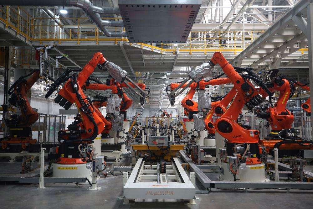 2023年5月29日在安徽合肥拍攝的大眾安徽模塊化電驅動(dòng)平臺工廠(chǎng)車(chē)身車(chē)間一角。新華社記者 杜瀟逸 攝