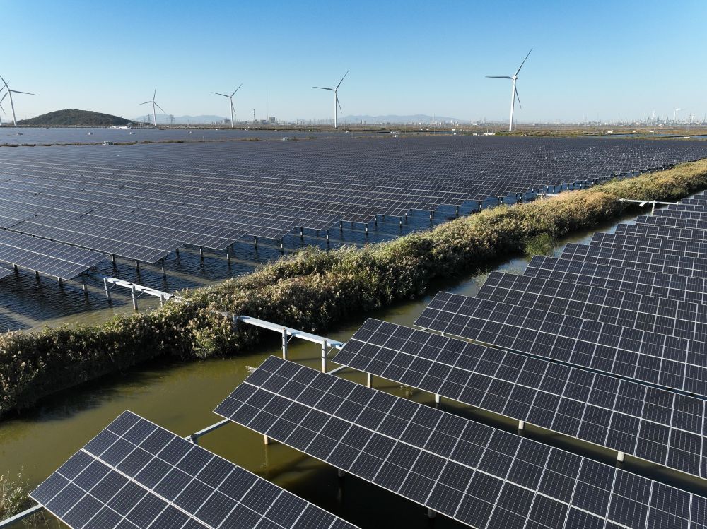 這是位于江蘇連云港市灌云縣圩豐鎮洋橋村的漁光互補發(fā)電項目(無(wú)人機照片,2023年11月17日攝)。新華社記者 季春鵬 攝