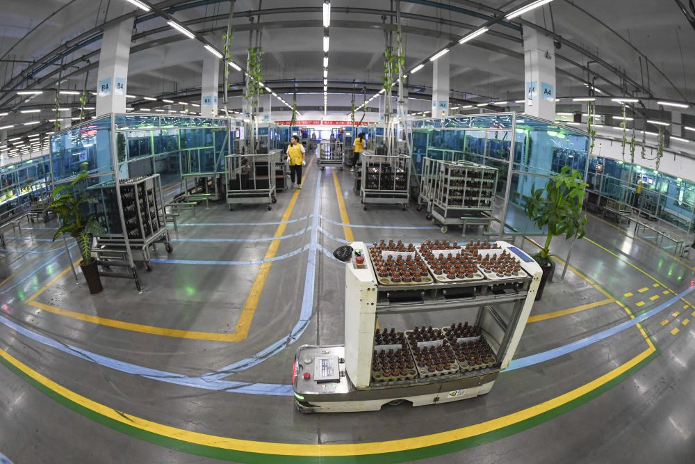 在江蘇蘇州一家企業(yè)生產(chǎn)車(chē)間,AGV小車(chē)在搬運物資(2020年9月18日攝)。新華社記者 季春鵬 攝