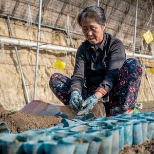 12月4日,在吉林省梨樹(shù)縣王家園子村一座育苗棚內,農戶(hù)在給育苗盆裝填培養土。新華社發(fā)(唐成卓 攝)