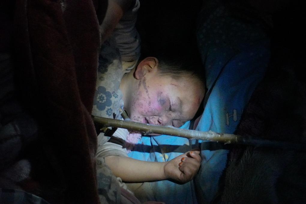 12月19日,在甘肅省臨夏回族自治州積石山保安族東鄉族撒拉族自治縣積石山縣中西醫結合醫院門(mén)口,一名受傷兒童得到安置和初步診療后熟睡。新華社記者 馬希平 攝