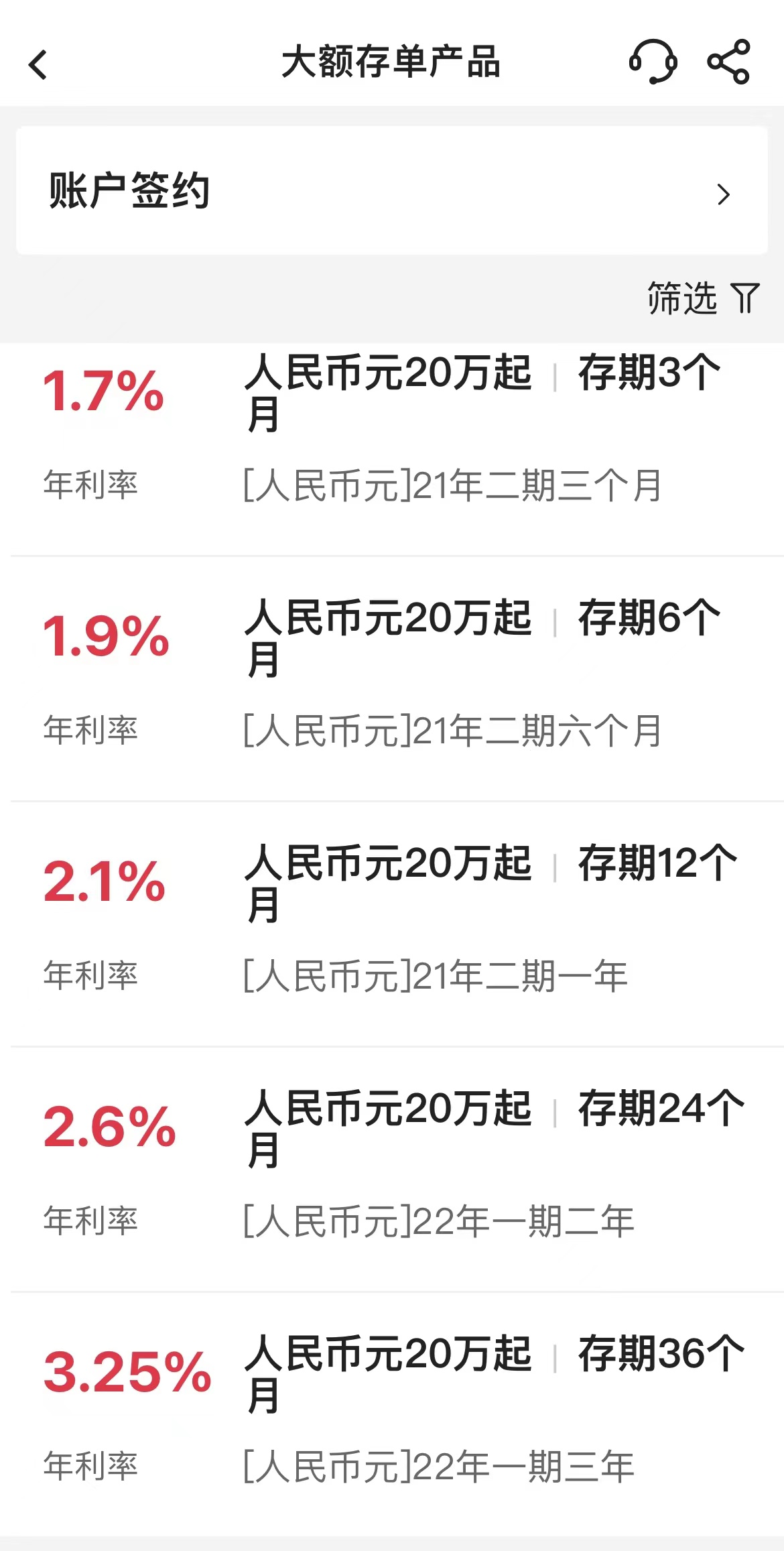 中國銀行App顯示,目前,1年期、2年期和3年期大額存單利率分別為2.1%、2.6%和3.25%,2年期和3年期大額存單利率較之前均下行,此前2年期和3年期大額存單利率分別為2.7%和3.35%。