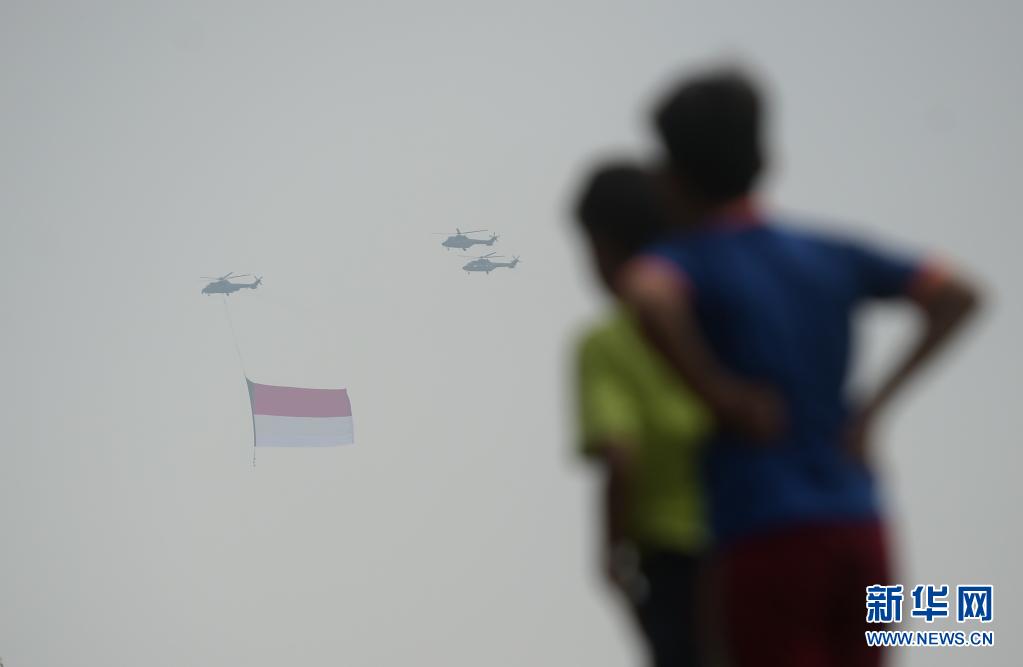 8月17日,人們注視著(zhù)懸掛印度尼西亞國旗的直升機飛過(guò)雅加達上空。8月17日是印度尼西亞獨立日。新華社發(fā)(祖卡南攝)