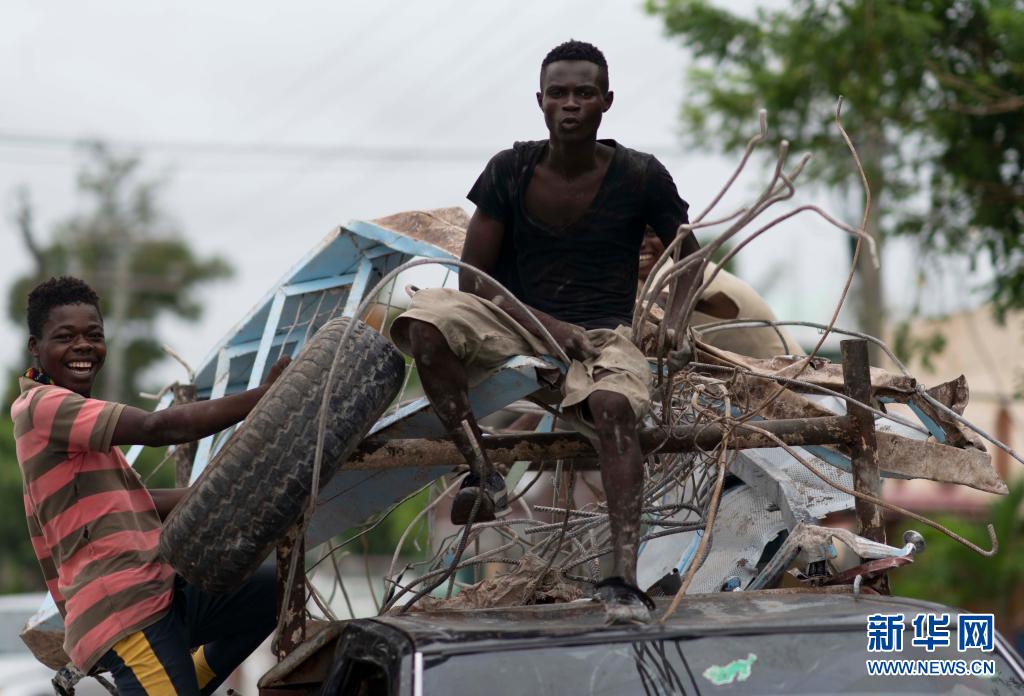 8月17日,兩名男子在海地萊凱搭乘汽車(chē)運送物品。
