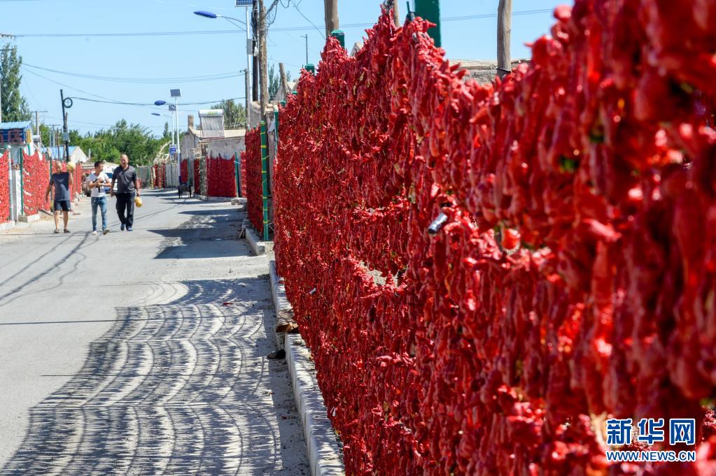 這是新疆巴里坤哈薩克自治縣三塘湖鎮一處掛滿(mǎn)辣椒的街道(8月19日攝)。