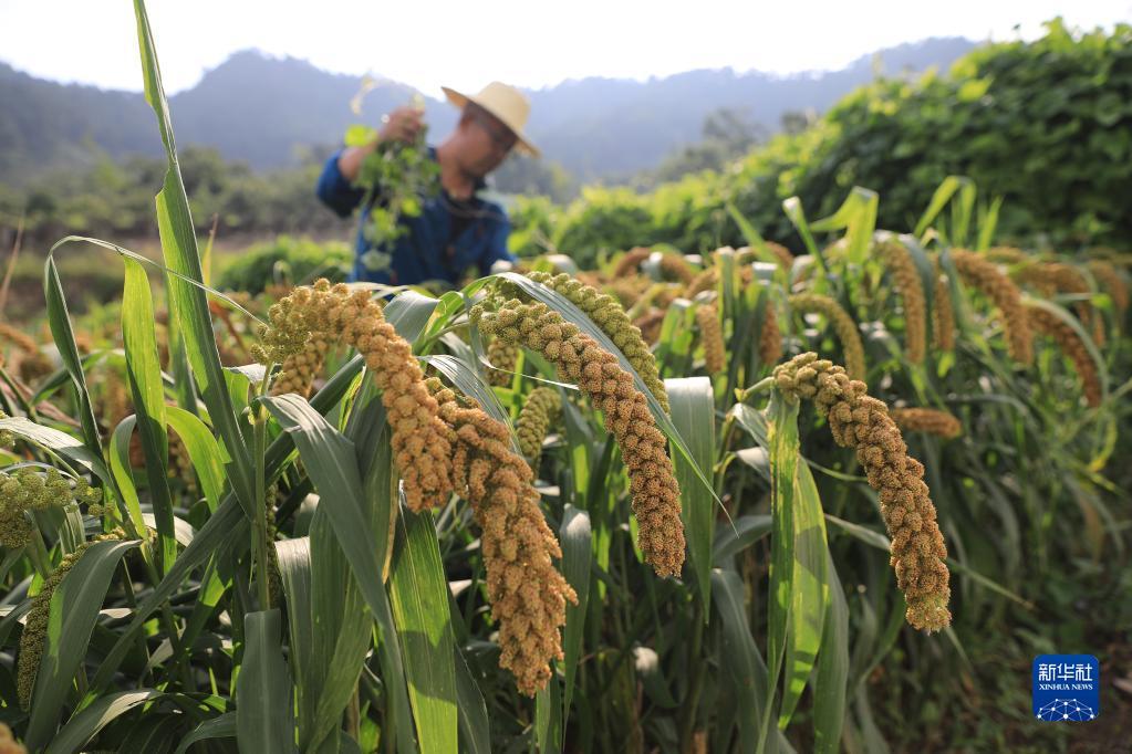 8月23日,河北省遷西縣興城鎮新立莊村農民在谷子地里勞作。