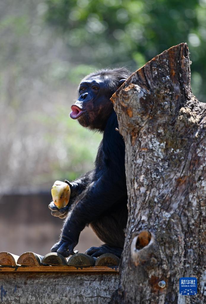 8月26日,一只黑猩猩在意大利羅馬動(dòng)物園享用冰凍食物。