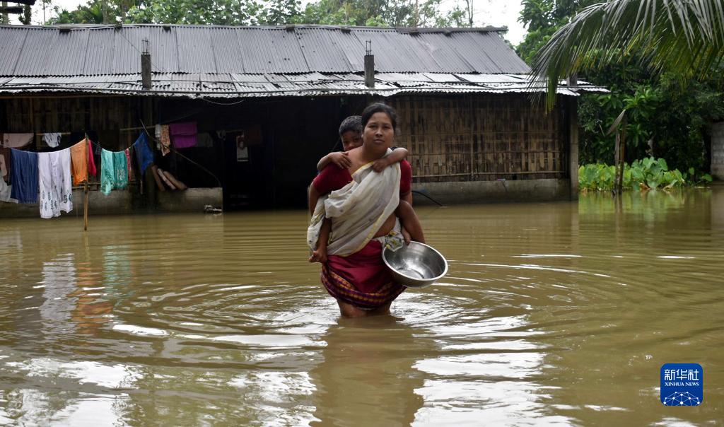 8月28日,一名女子帶著(zhù)孩子在印度阿薩姆邦一村莊的洪水中行走。