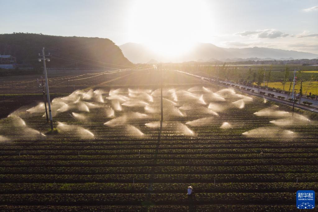 8月30日,在濂溪大洞蔬菜基地,灌溉系統在給蔬菜澆水(無(wú)人機照片)。