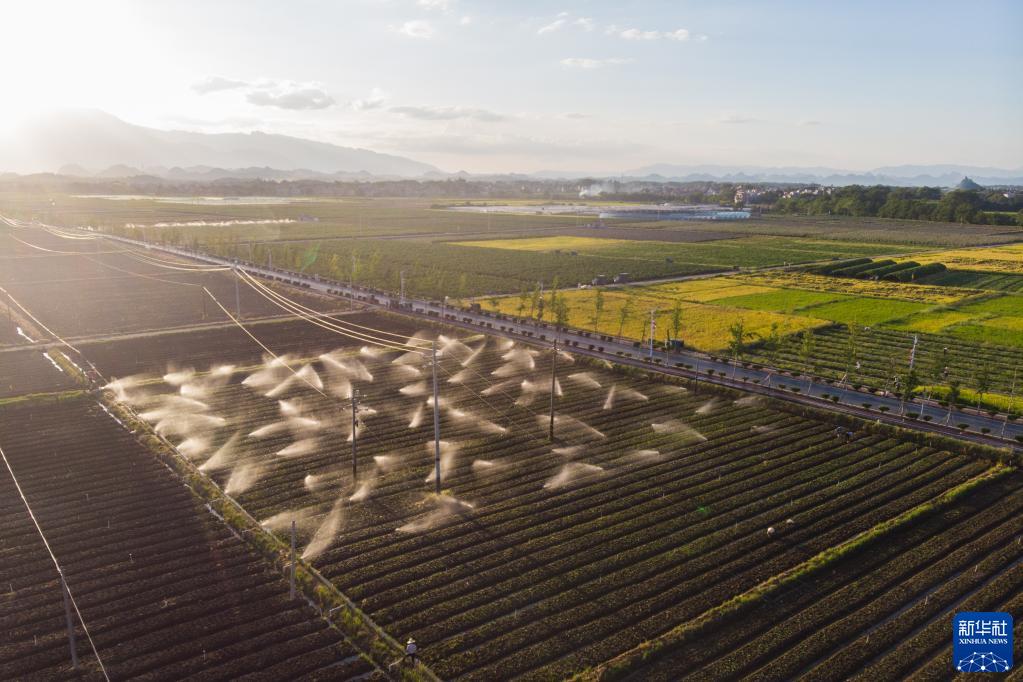 8月30日,在濂溪大洞蔬菜基地,灌溉系統在給蔬菜澆水(無(wú)人機照片)。