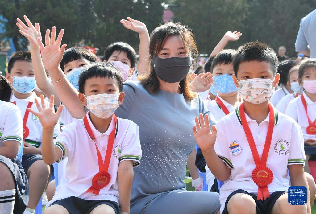 9月1日,在北京市海淀區太平路小學(xué),一年級新生與老師一起參加開(kāi)學(xué)典禮。