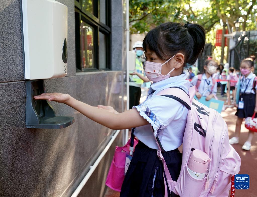 9月1日,上海市黃浦區盧灣二中心小學(xué)的學(xué)生入校后進(jìn)行手部消毒。