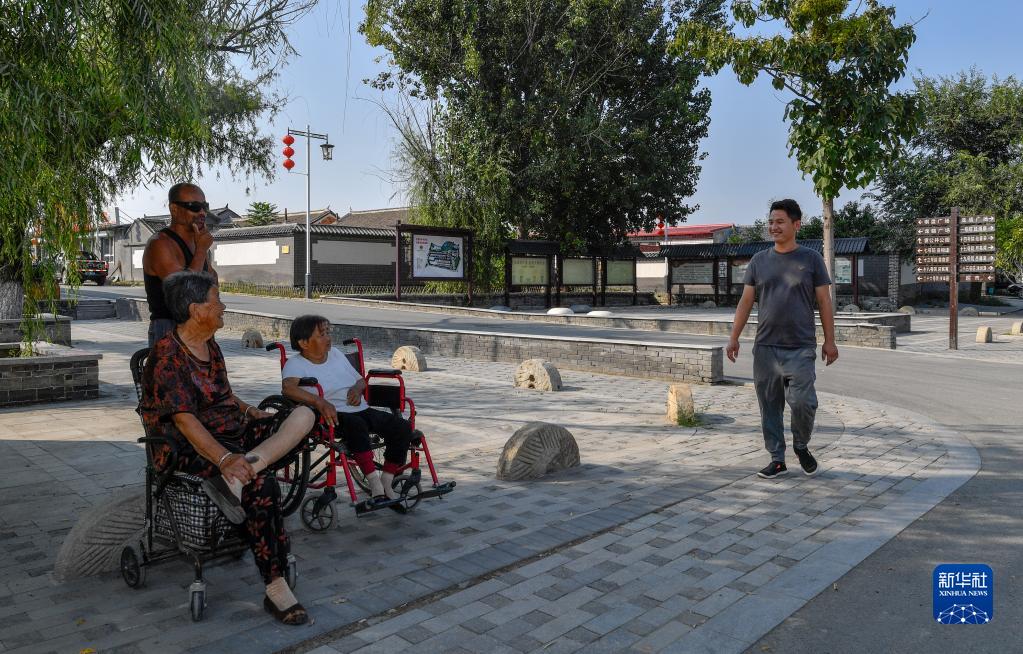 在天津市寶坻區黃莊鎮小辛碼頭村,擔任村委委員的李超(右一)在巡視時(shí)與村民交流(9月2日攝)。新華社記者 孫凡越 攝