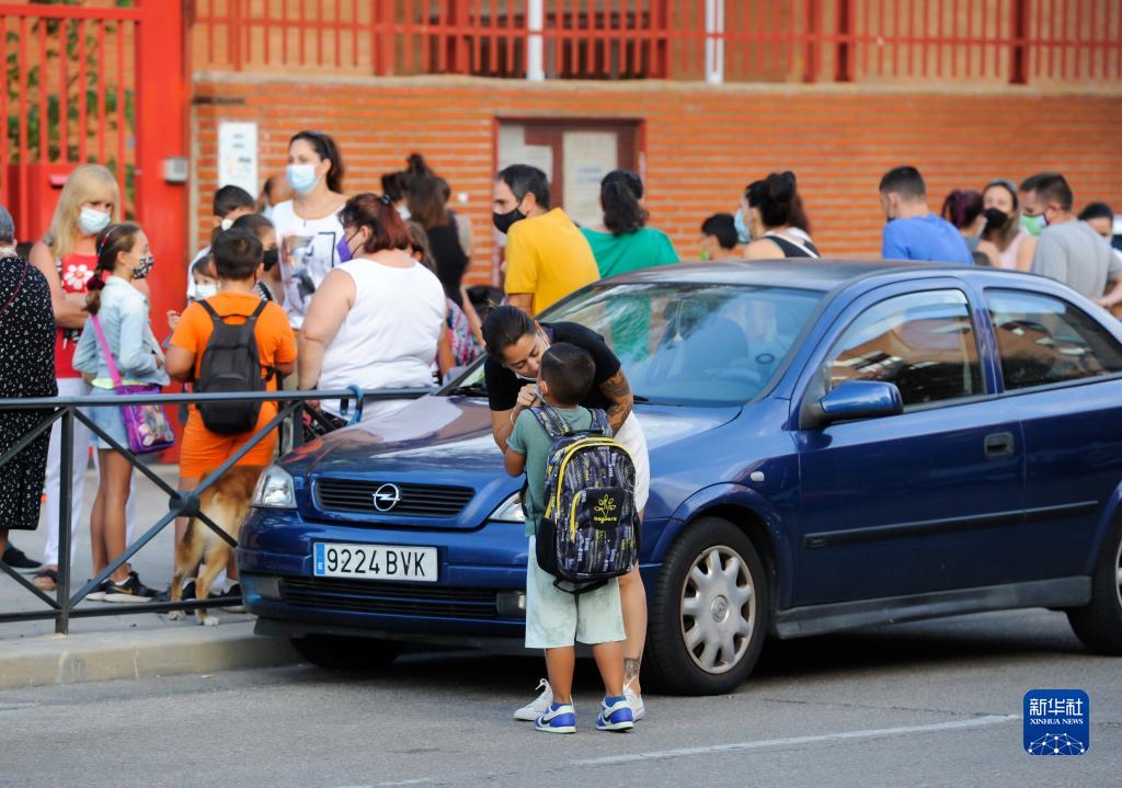 9月8日,一名家長(cháng)在西班牙馬德里的一所學(xué)校外與孩子告別。