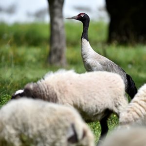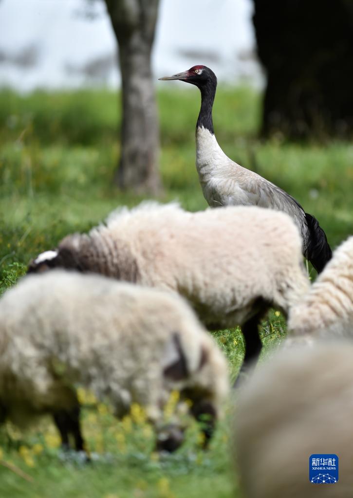 在西藏日喀則市扎什倫布寺院內,一只黑頸鶴與一群放生羊生活在一起,和睦相處。這只黑頸鶴曾因受傷無(wú)法遷徙,被附近的村民送到寺廟院里。如今,黑頸鶴儼然成了羊群的“頭羊”,被當地人稱(chēng)為“牧羊的鶴”。