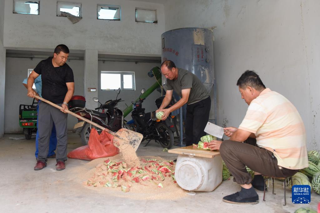 在新疆野馬繁殖研究中心,工作人員為野馬制作“西瓜解暑餐”(8月10日攝)。