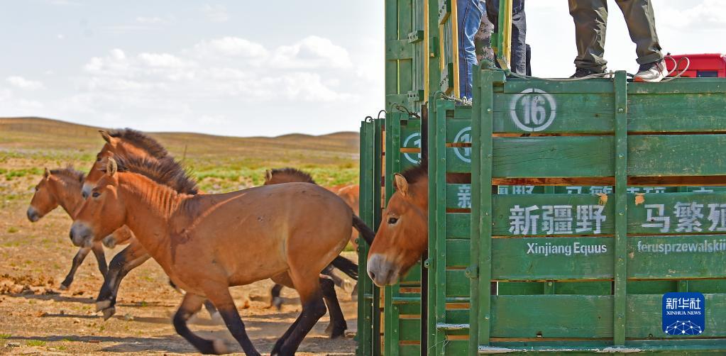 在新疆卡拉麥里山有蹄類(lèi)野生動(dòng)物自然保護區喬木西拜野放點(diǎn),工作人員將即將野放的野馬放入大圍欄,使其適應野外環(huán)境(9月1日攝)。