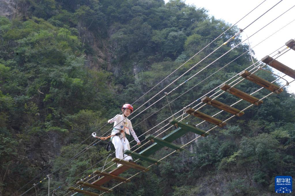 10月2日,在貴陽(yáng)市開(kāi)陽(yáng)縣南江大峽谷,游客在安全措施的保護下體驗過(guò)天梯。