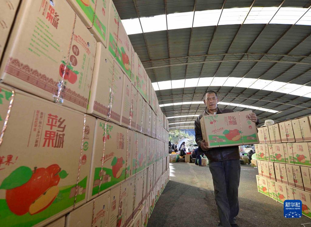 10月20日,在四川甘孜鄉城縣青德鎮萬(wàn)畝果園,村民搬運包裝好的蘋(píng)果。