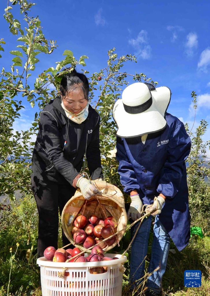 10月20日,在四川甘孜鄉城縣青德鎮萬(wàn)畝果園,村民收集剛采摘的蘋(píng)果。
