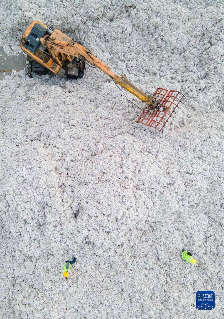 新疆沙灣市一家棉花收購廠(chǎng)的工人整理剛收購的新棉(10月20日攝,無(wú)人機照片)。新華社記者 胡虎虎 攝