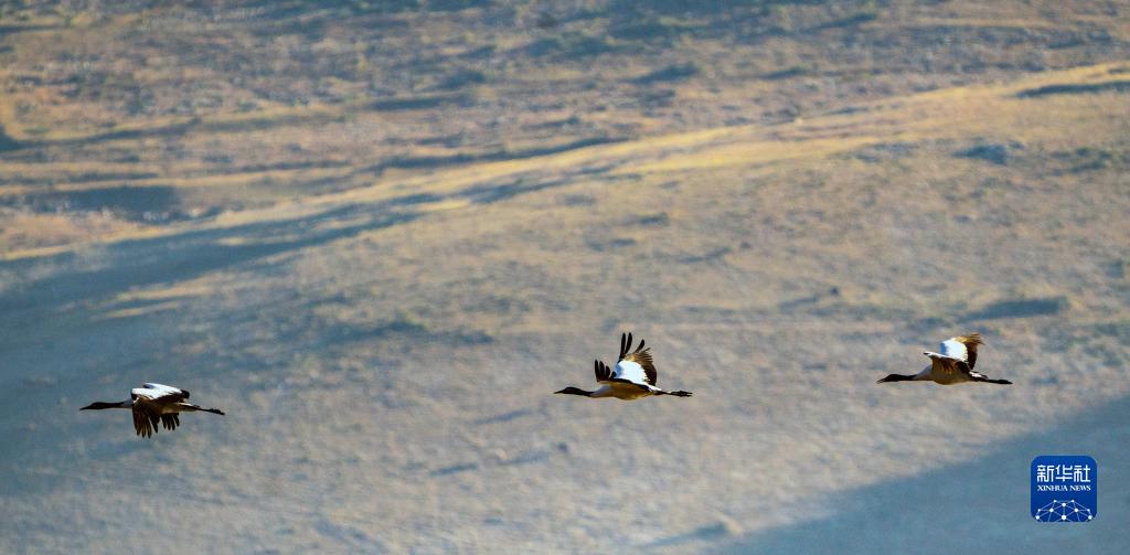 10月29日,黑頸鶴飛翔在納帕海上空。