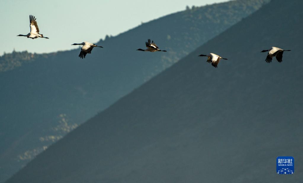 10月29日,黑頸鶴飛翔在納帕海上空。