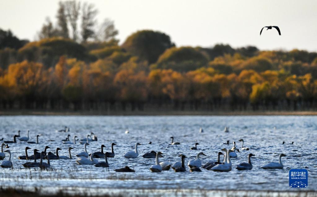 10月30日,一群白天鵝在河口水庫濕地游弋。