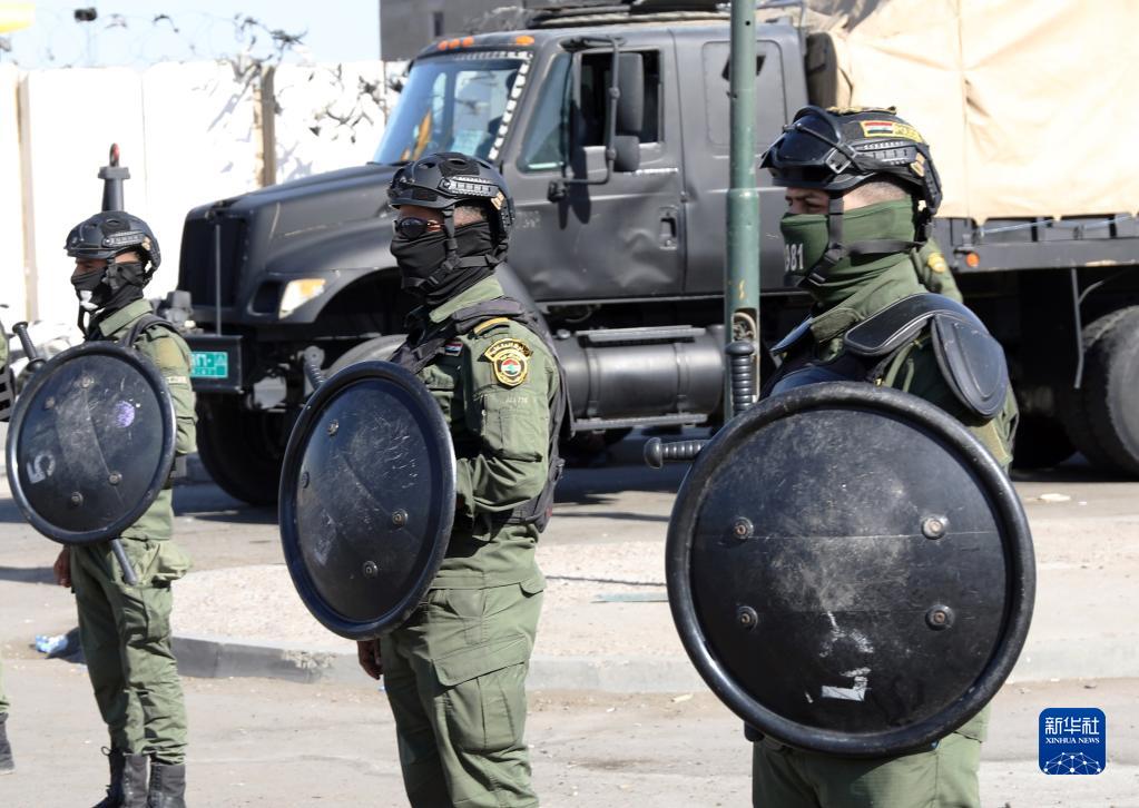 11月7日,防暴警察在伊拉克巴格達“綠區”附近警戒。