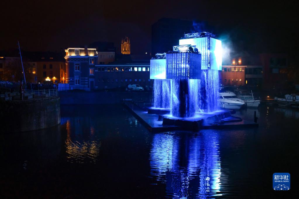 這是11月11日在比利時(shí)根特燈光節上拍攝的燈光藝術(shù)作品。