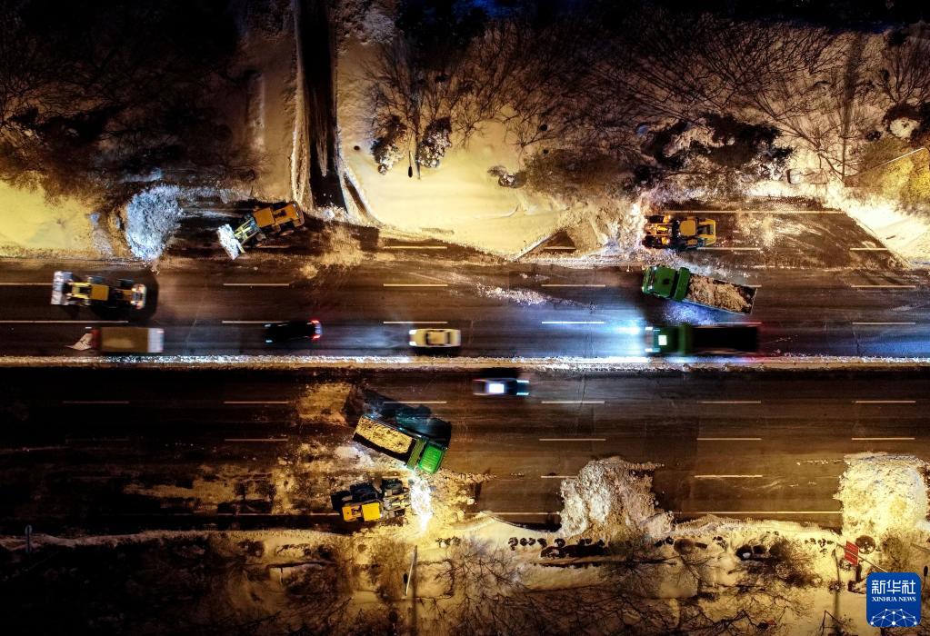 11月11日晚,在通遼市城區,作業(yè)車(chē)輛連夜清理積雪(無(wú)人機照片)。