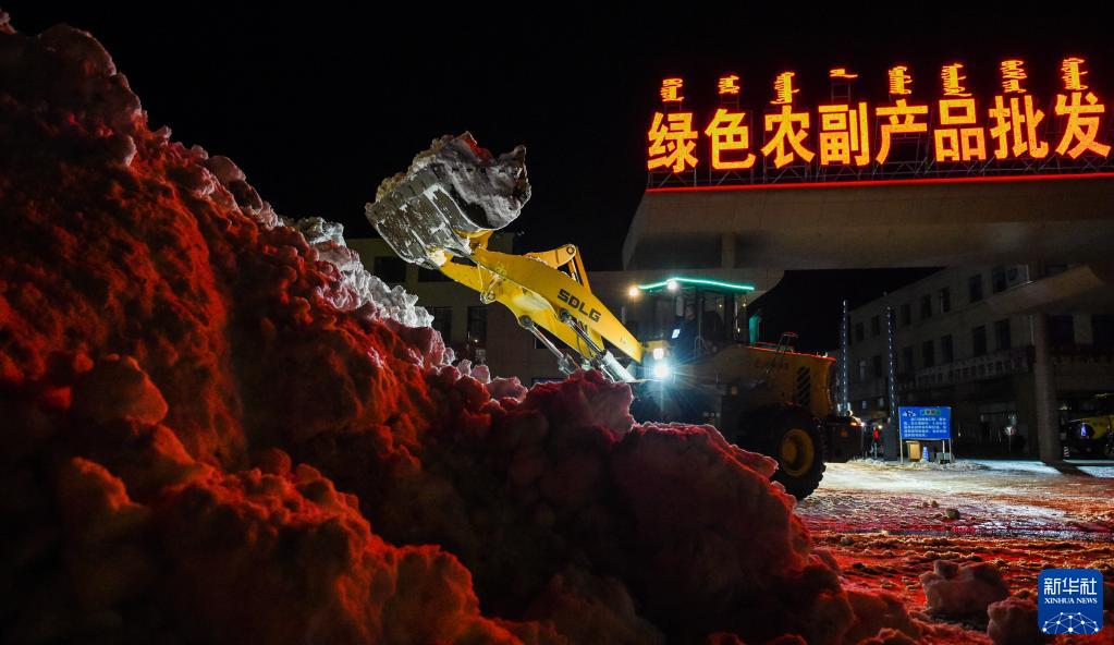 11月11日晚,在通遼市運達綠色農副產(chǎn)品批發(fā)市場(chǎng),作業(yè)車(chē)輛連夜清理積雪。