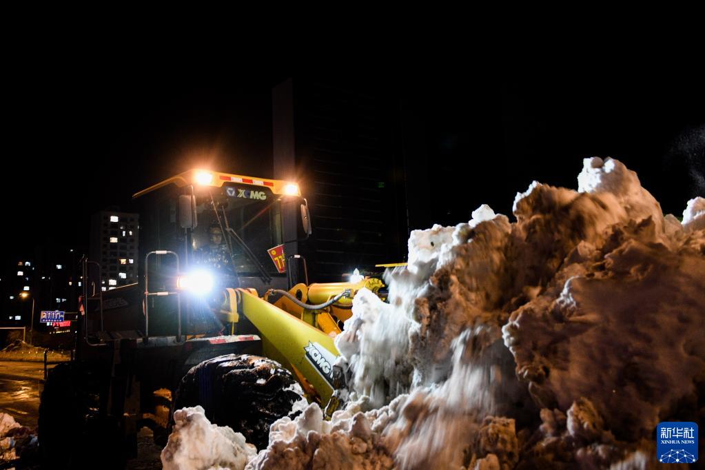 11月11日晚,在通遼市城區,作業(yè)車(chē)輛連夜清理積雪。