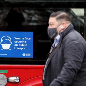11月24日,英國倫敦的公共汽車(chē)上貼著(zhù)提醒人們佩戴口罩的防疫告示。