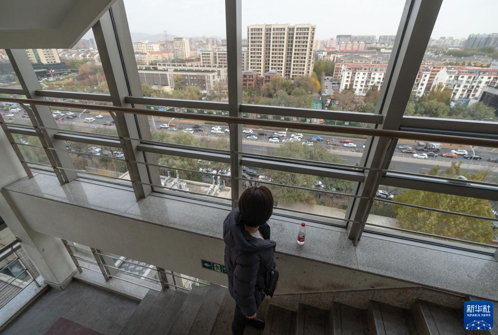 11月15日,在北京大學(xué)腫瘤醫院手術(shù)室旁的樓梯間,吳姝在等待媽媽手術(shù)結束。