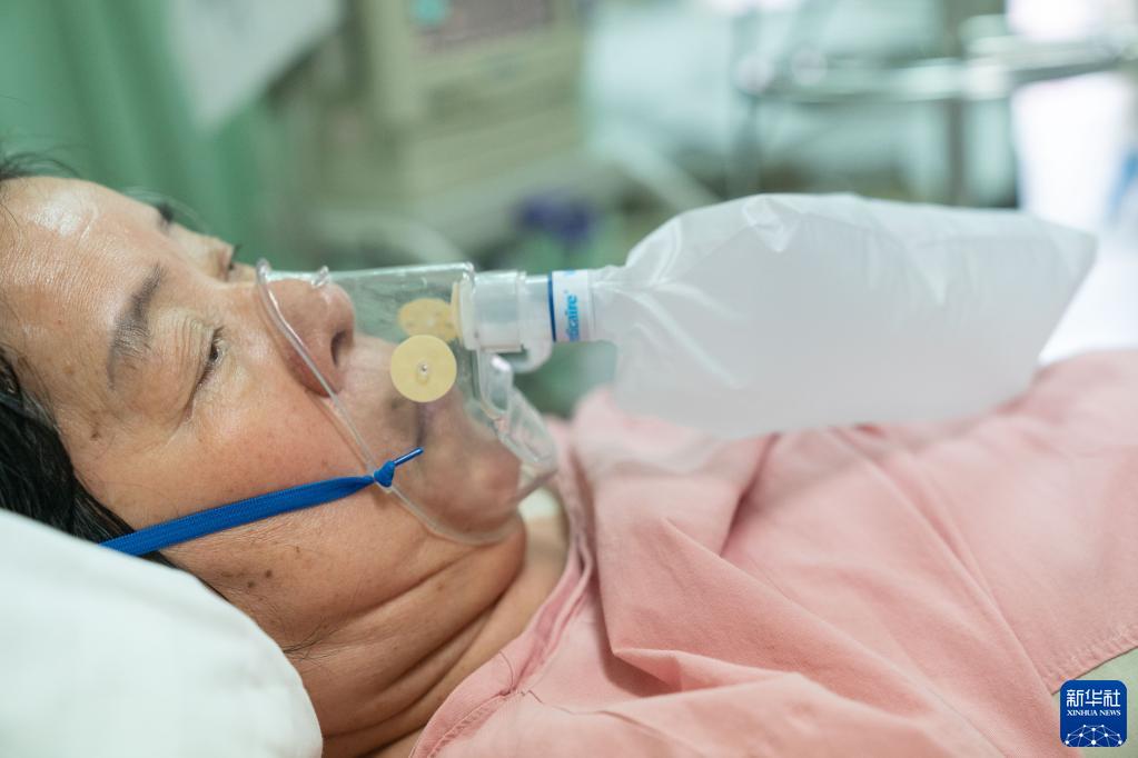 11月18日,在北京大學(xué)腫瘤醫院肝膽胰外一科病房,沈建群在手術(shù)后躺在病床上吸氧。