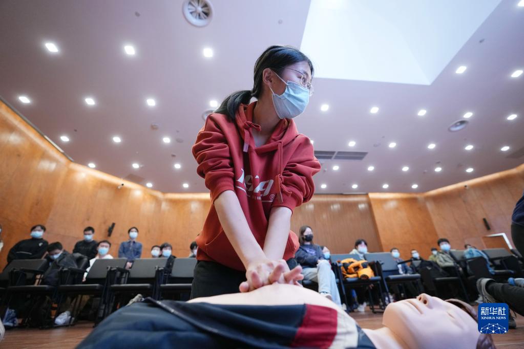 11月28日,清華大學(xué)計算機系的冬奧學(xué)生志愿者王昊華在急救技能培訓上學(xué)習心肺復蘇術(shù)。新華社記者 鞠煥宗 攝